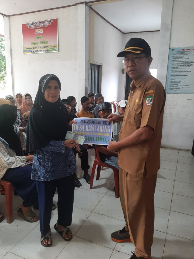 Senin 25 November 2024, bertempat di Balai Desa Kayu pembagian BLT DD berlangsung di Laksanakan dari pukul 09.00 wib sampai dengan selesai.Pemerintah Desa Kayu Arang melakukan kegiatan bantuan langsung tunai Dana Desa (BLT DD) di salurkan secara tunai ke 55 keluarga penerima manfaat (KPM), dan setiap KPM masing masing menerima bantuan sebesar Rp. 300.000 perbulan, untuk bulan oktober dan november dengan total yang di terima sebesar Rp. 600.000 setiap KPM.
